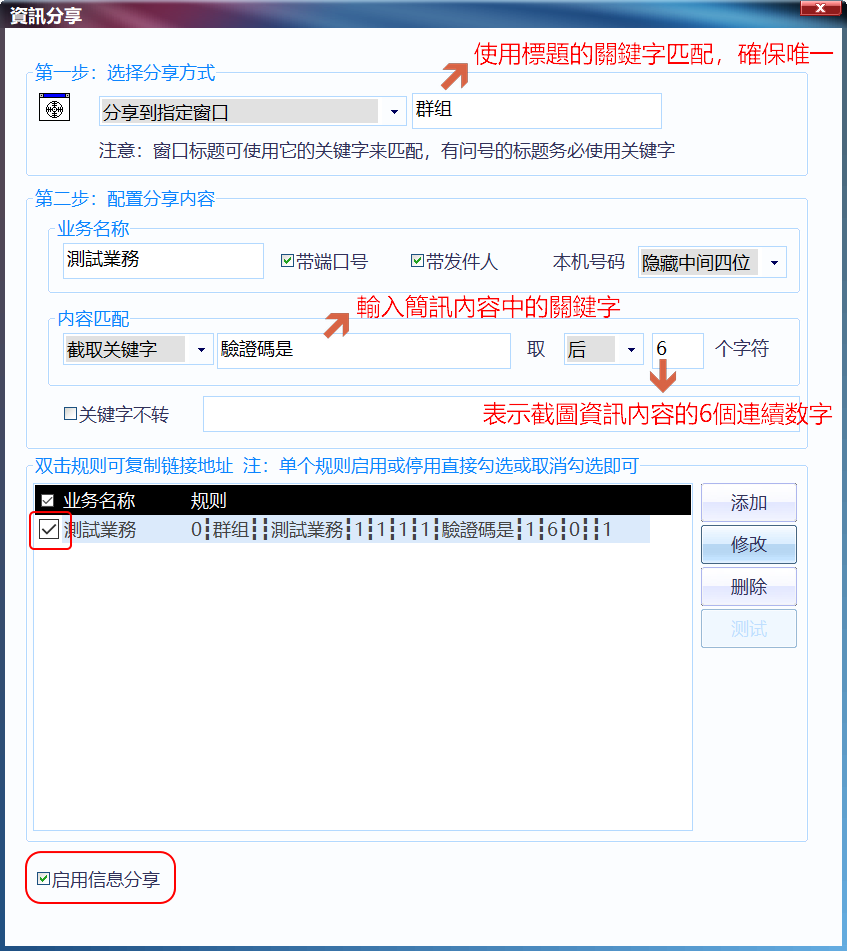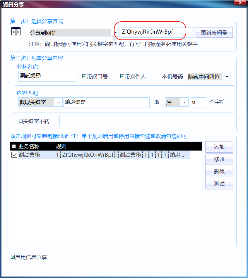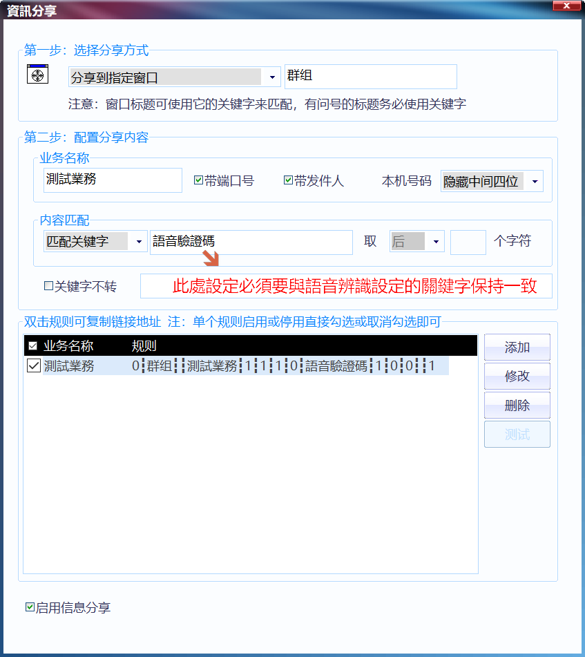 第二步:如果需要将识别的内容分享出去,请参考資訊分享教程,如图所示配置: