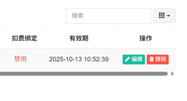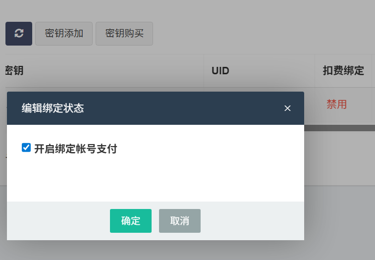 第五步:启用扣费绑定功能,在添加的密钥行,点"编辑",在弹出的窗口中勾选开启绑定帐号支付,点击"确认"。