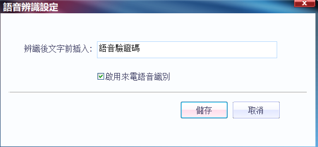第一步:点击软件按钮【使用者配置】【來電設置】【语音识别】,勾选:啟用來電語音識別,如果需要使用信息分享将识别到的语音内容分享出去,必须同时要设置辨識後文字前插入,设置一个关键字,保存